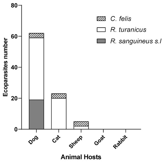 Ectoparasites were collected from a variety of domestic animals, with dogs accounting for the majority of infestations (74.12%; n = 444). Other host contributions were as follows: sheep (n = 89), cats (n = 56), and goats and rabbits (n = 21). Dogs are recognized as the primary domestic reservoir of L. infantum in Algeria [49,50].