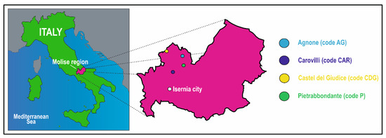Location of the study areas. The colored circles denote the municipalities of Agnone (code AG), Carovilli (code CAR), Castel del Giudice (code CDG), and Pietrabbondante (code P) in the “Alto Molise” area, Molise region, Central-Southern Italy.