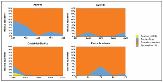In truffles collected from the municipality of Carovilli, Pseudomonadota was the most represented phylum, with relative abundance values ranging from 84.49% (sample CAR5) to 99.70% (sample CAR1). Bacteroidota were present in samples CAR2, CAR4, and CAR5, with relative abundances of 12.71%, 1.88%, and 14.89%, respectively.