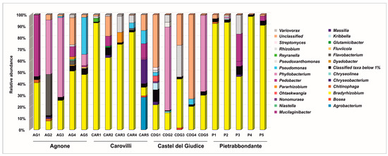 At the genus level (Figure 4), Bradyrhizobium was the most abundant classified taxon in all samples from Pietrabbondante, with relative abundances ranging from 46.19% to 98.37%. This genus also predominated in four samples from Carovilli (CAR1, CAR2, CAR3, and CAR4), where its relative abundance varied from 62.69% to 92.87%. In contrast, CAR5 bacterial community was dominated by Agrobacterium (28.27%), Massilia (20.91%), Pedobacter (12.59%), and Pseudomonas (11.43%), with Bradyrhizobium ranking fifth (7.37%).