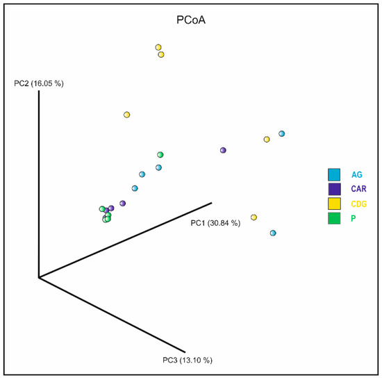 Plot of the Principal Coordinate Analysis (PCoA) based on Bray–Curtis metric, showing the bacterial communities associated with ascocarps collected from Agnone (AG; light blue), Carovilli (CAR; blue), Castel del Giudice (CDG; yellow), and Pietrabbondante (P; green).