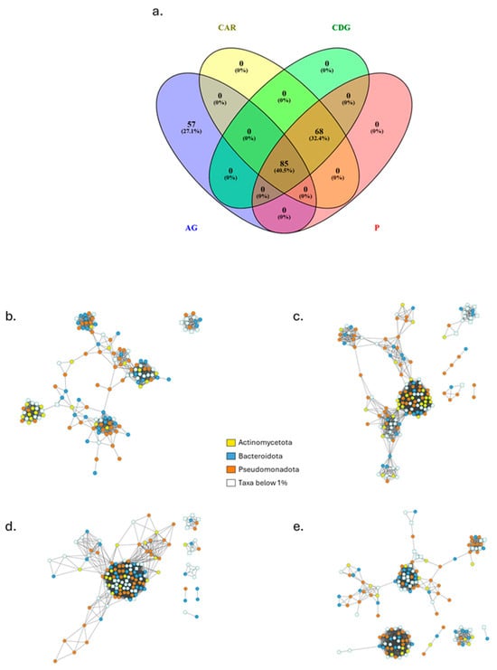 Overlap among taxa of the individual truffle populations (a) and the related networks of Agnone (AG; (b)), Carovilli (CAR; (c)), Castel del Giudice (CDG; (d)) and Pietrabbondante (P; (e)) samples. Round and square nodes represent bacterial and fungal species, respectively. Colors trace the main abundant phyla.
