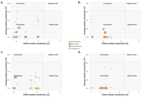 Zi-Pi scatterplots showing the classification of nodes to identify potential keystone taxa in the four truffle populations from Agnone (AG; (a)), Carovilli (CAR; (b)), Castel del Giudice (CDG; (c)), and Pietrabbondante (P; (d)) in peripherals, modular hubs, connectors or network hubs. Module connectors are above the horizontal dashed line (Pi = 0.62), while module hubs are at the right of the vertical dashed line (Zi = 2.5). Network hubs are in the top right area. Dot colors represent the phyla to which the different taxa belong.