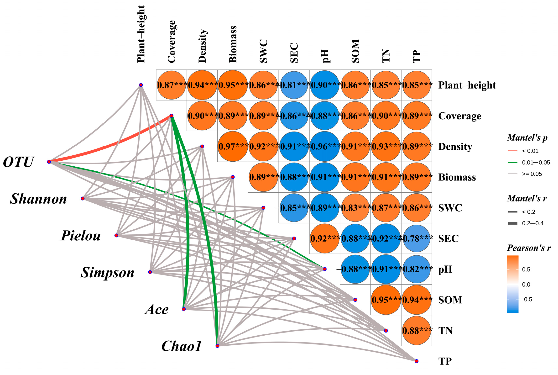 3.8.1. Mantel Test Analysis of Vegetation–Soil–Microbe Interactions