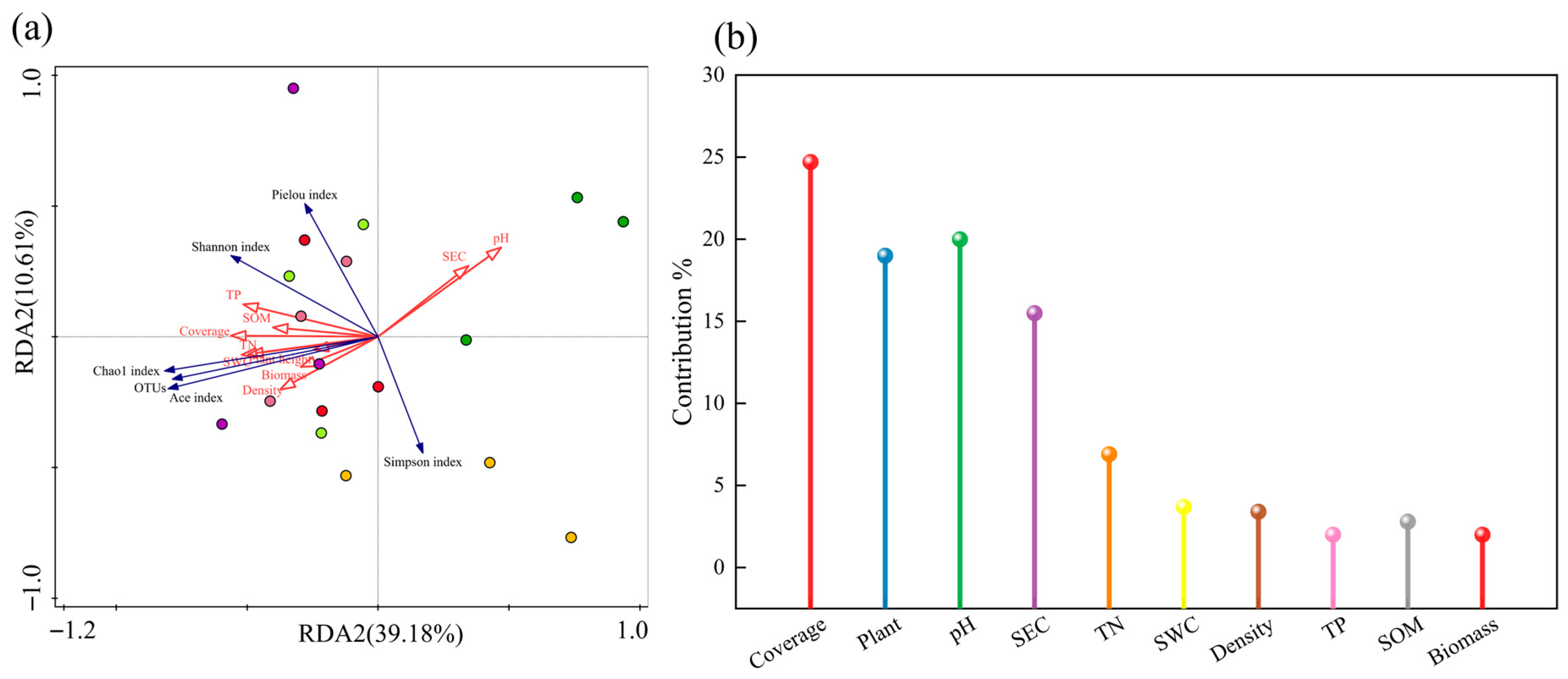 3.8.2. RDA of Vegetation–Soil–Bacteria Relationships