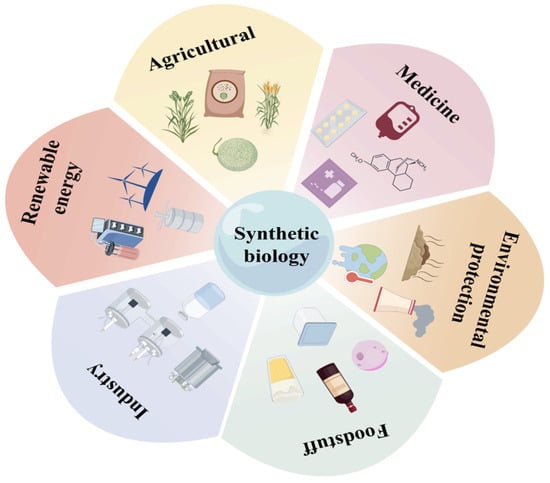 Synthetic biology is an emerging interdisciplinary field that integrates biochemistry, molecular biology, informatics, and statistics, among other disciplines. It employs synthetic techniques to enable the targeted design and modification of cells or organisms, thereby endowing them with novel and specialized functions []. This field facilitates the design and fabrication of new biological components, devices, and systems, ultimately contributing to the creation of “artificial life.” Additionally, it allows for the redesign and modification of existing natural biological systems, resulting in what is termed “engineered life” [,,]. Key research directions in synthetic biology include: the design and construction of genetic regulatory networks to program and control cellular behaviors; the optimization and reconstruction of metabolic pathways to enhance the yield and efficiency of target products; the design and synthesis of minimal or functional genomes for constructing organisms with new capabilities; the engineering of proteins to confer novel functions or improve their performance; and the application of synthetic biology in modifying microbial cells for biomanufacturing and environmental remediation [,,,,,]. In summary, synthetic biology offers the potential to construct new biological systems that address pressing challenges such as environmental management. It also leverages the diversity of existing biological entities to create predictable and controllable synthetic assemblies tailored to human needs, including applications in pharmaceuticals, disease diagnosis, and therapy [,,]. Figure 1 provides an overview of the application domains of synthetic biology.