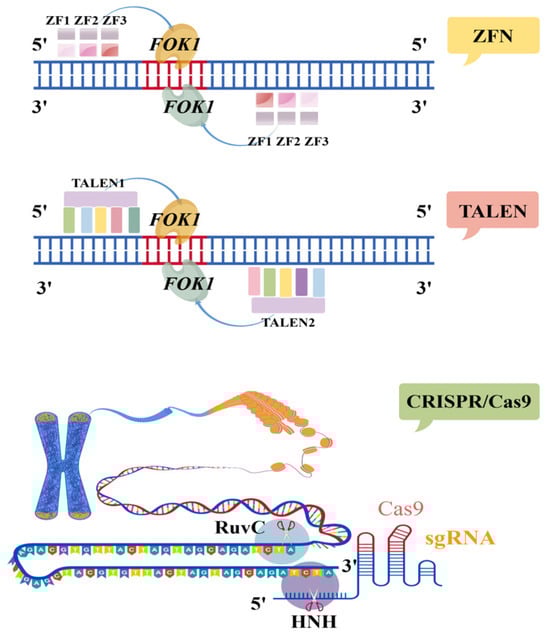 Although both TALENs and CRISPR/Cas9 systems enable precise genome editing at specific sites, they differ significantly in their molecular mechanisms. TALENs rely on protein-DNA interactions for target recognition, whereas the CRISPR/Cas9 system utilizes RNA-guided DNA targeting through complementary base pairing []. Table 2 summarizes the key differences among the three major gene editing technologies, and Figure 2 illustrates the molecular mechanisms by which ZFNs, TALENs, and CRISPR/Cas9 introduce double-strand breaks in DNA.