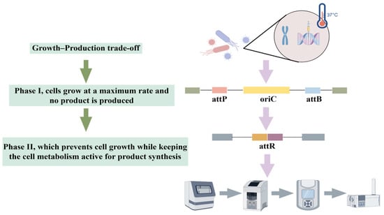 Studies have shown that this strategy has achieved remarkable results in different metabolic systems. By overexpressing desaturase genes de1 and de2, Xu et al. [] not only significantly enhanced the total fatty acid content of E. coli, but also optimized the fatty acid composition, promoted the conversion of octadecanoic acid to oleic acid, and increased the proportion of monounsaturated fatty acids. On the other hand, Zhang et al. [] innovatively adopted a combinatorial regulatory strategy to finely regulate the expression of LysCr and Homr, the key enzymes of the L-homoserine synthesis pathway, in Corynebacterium glutamicum by using promoters of different strengths and RBS elements, and successfully constructed an engineered strain that synthesized L-homoserine efficiently, with a yield of 12.7 g/L, which is 3.6-fold higher than that of the wild-type strain. These studies not only confirmed the effectiveness of the key enzyme expression regulation strategy, but also demonstrated the great potential of metabolic pathway optimization through systematic engineering modification. Figure 3 depicts a novel growth switch developed by Marje Kasari et al. [], based on the permanent removal of the replication origin (oriC) from the E. coli chromosome. Without oriC, cells cannot initiate a new round of replication, causing them to cease growth while metabolism remains active. Their system relies on the serine recombinase from phage phiC31, whose expression is controlled by the temperature-sensitive cI857 repressor from phage lambda. Report protein expression persists in transformed cells after growth arrest, resulting in protein levels five times higher than in non-transformed cells.