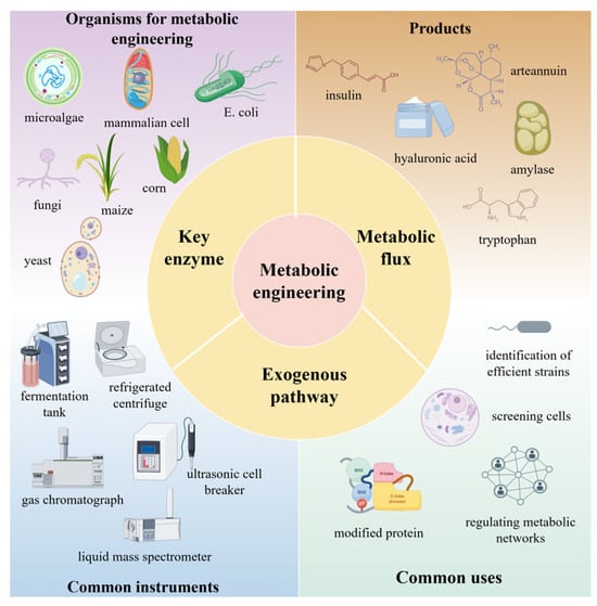 Yu et al. [] systematically regulated the EMP pathway, PPP and TCA cycles through the introduction of exogenous sodium fumarate (SF), which not only increased the substrate level and reduced the energy consumption, but also promoted the synthesis of the major fatty acids of astaxanthin esters, and thus significantly enhanced the accumulation efficiency of astaxanthin under nitrogen-deficient conditions. This study not only elucidated the key role of the respiratory metabolic pathway in astaxanthin synthesis, but also provided a new technological idea for the efficient biosynthesis of carotenoids. The study by Jiao Feng et al. [] demonstrated the potential application of exogenous pathway import in bioelectrochemical systems. An engineered strain with enhanced electrochemical activity was successfully constructed by introducing the Mtr pathway (The Mtr pathway is one of the most extensively studied electron transfer pathways and has been successfully engineered in Escherichia coli []) of Shewanella oneidensis into E. coli. The strain was able to utilize exogenous electrons to modulate the metabolite profile and promote the biosynthesis of succinate, which provided an important theoretical basis and technological support for the improvement of electron transfer efficiency and the development of novel bioelectrochemical systems. Exogenous pathway introduction will become more precise and efficient, opening new research directions and application fields for metabolic engineering. Figure 4 summarizes the main components of metabolic engineering, including commonly used engineered organisms (e.g., microalgae, E. coli, fungi), key tools (e.g., fermenters, mass spectrometers), core concepts (e.g., metabolic flux, exogenous pathways), and target products (e.g., insulin, hyaluronic acid).