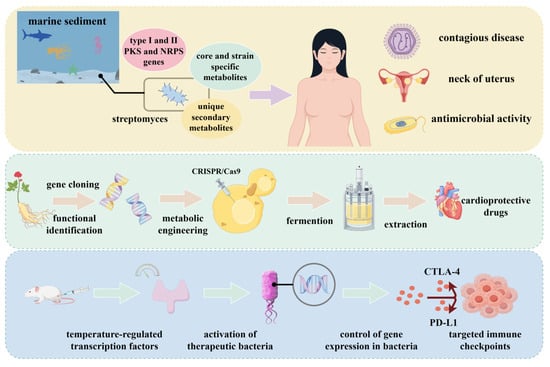 Figure 5 illustrates the application of synthetic biology in engineering industrial microorganisms for disease treatment. Edna M Sabido et al. [] isolated Streptomyces strains from marine sediments. The crude extract derived from these strains inhibited the growth of ESKAPE pathogens and demonstrated antiproliferative activity against A2780 human ovarian carcinoma cells at a concentration of 2 mg/mL. Yanxin Li et al. [] focused on ginsenosides derived from ginseng. Using CRISPR/Cas9 technology, they introduced glycosyltransferase genes into suitable microbial hosts. Batch fermentation in bioreactors yielded modified ginsenosides, and subsequent in vitro assays confirmed that these compounds protect cardiomyocytes against hypoxia/reoxygenation (H/R)-induced injury. Mohamad H. Abedi et al. [] developed a genetic state switch activated by focused ultrasound-induced temperature changes. This system enables precise, spatiotemporal control of therapeutic gene expression in bacterial cells, offering a versatile platform for targeted antibacterial therapies across various biological and clinical contexts.