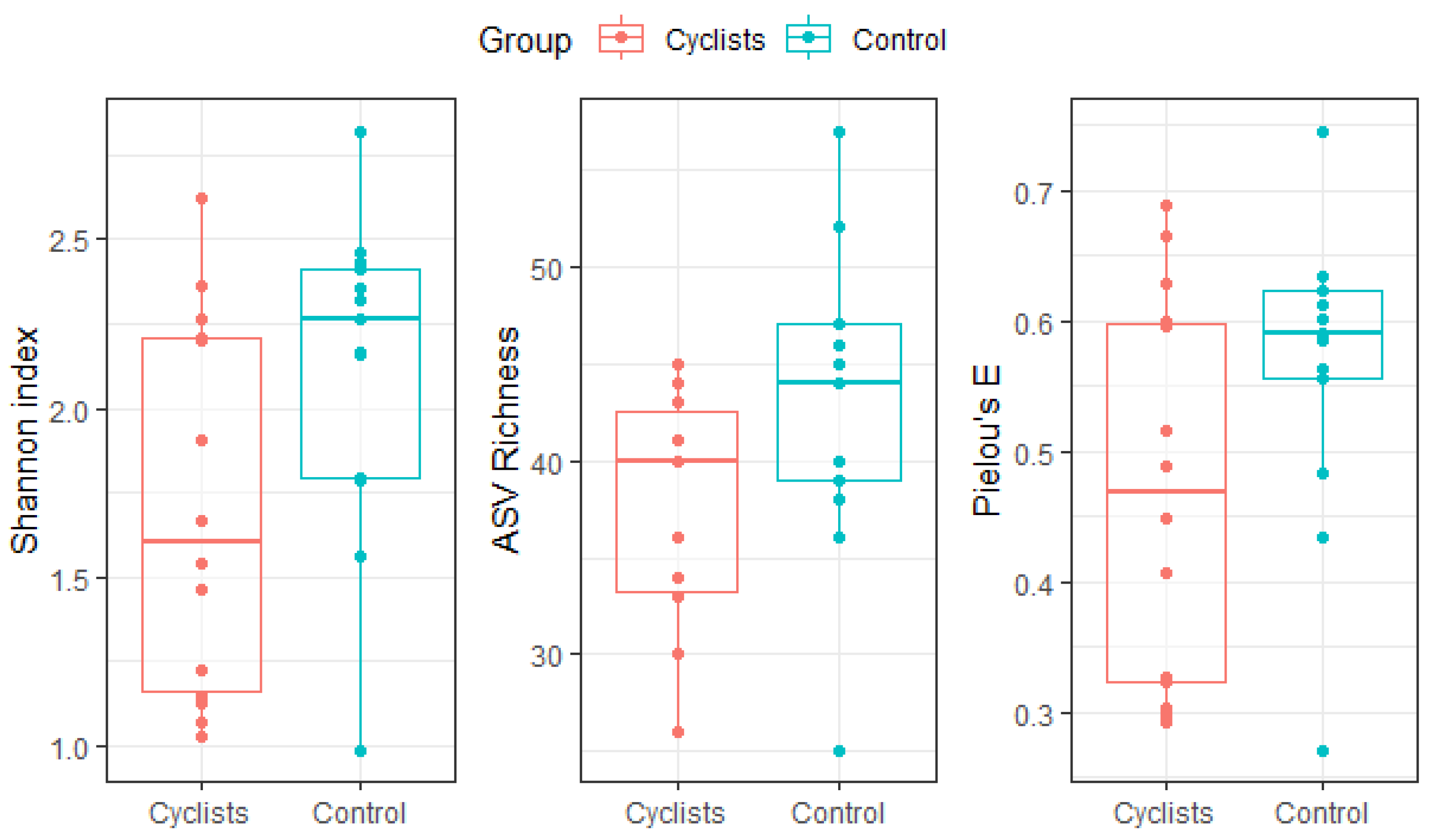 Figure 1. Gut microbiome α-diversity (i.e., Shannon index), ASV richness and evenness (i.e., Pielou’s E) for both groups (i.e., cyclists, controls). Dots represent individual values.