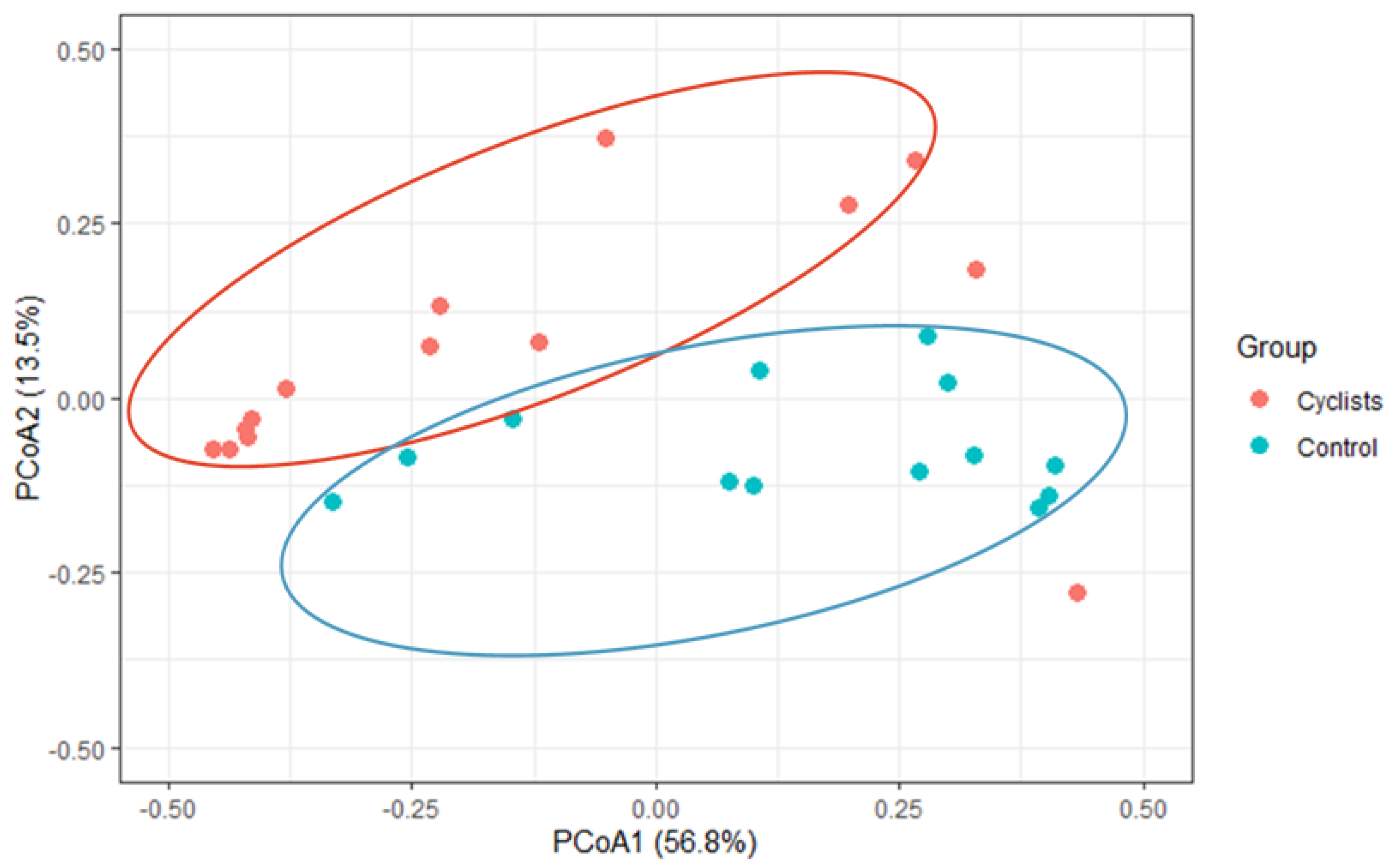 Figure 2. β-diversity (Bray–Curtis) via principal coordinate analysis (PCoA). A significant clustering within the cyclist and control group, respectively, was found (p = 0.007).