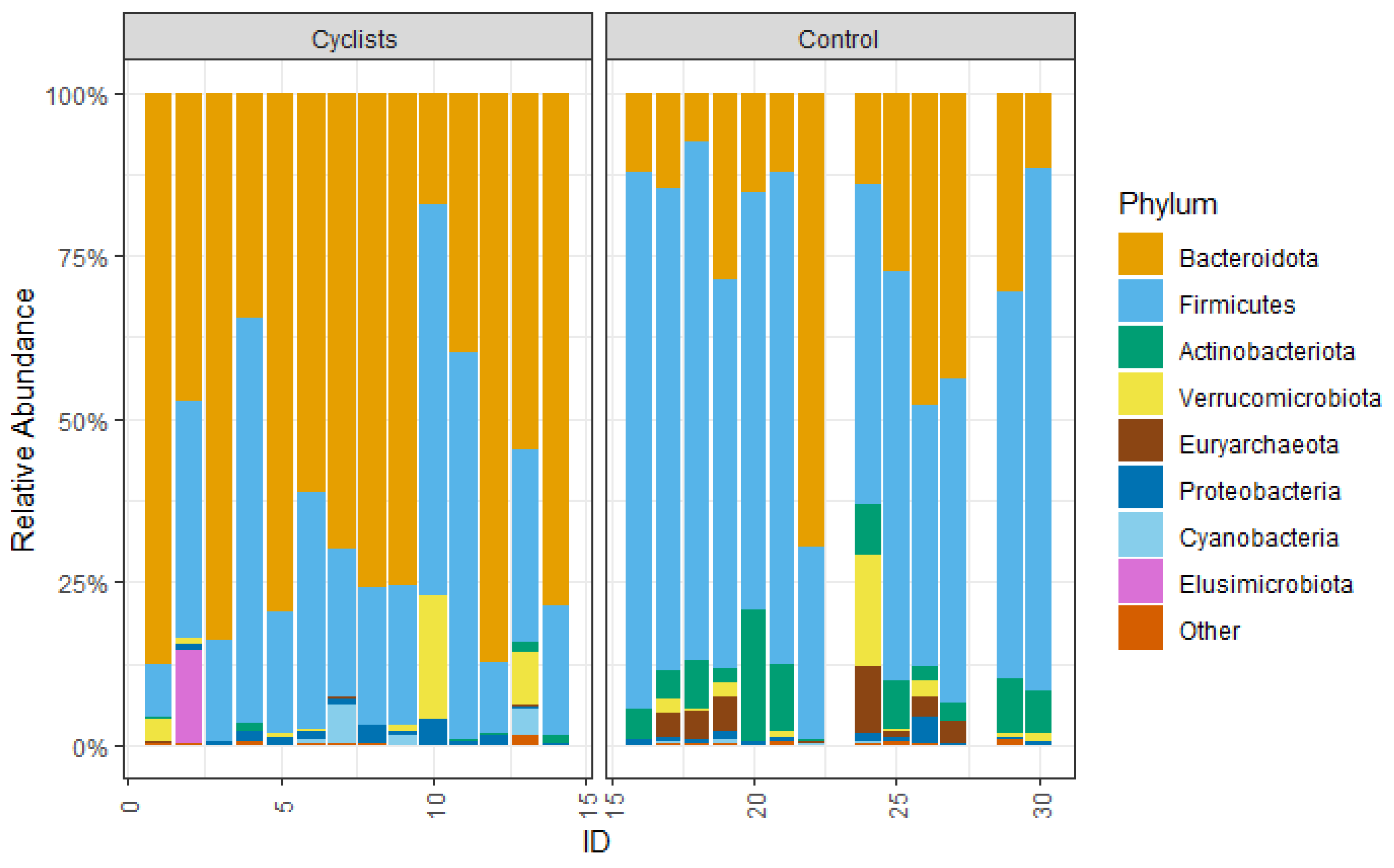 Despite this research, significant knowledge gaps remain, particularly in elite (female) athletes. Women are underrepresented in sports science research, and sex-specific physiological and hormonal factors may lead to unique microbiome adaptations [34,35]. This study aimed to address this gap by profiling the gut microbiome of elite female cyclists competing at the World Tour level. It is hypothesized that their gut microbiome has evolved due to the chronic physical stressor of cycling at the highest level and the specific diet and supplementation used to optimize their endurance performance. Therefore, to our knowledge, this was the first study to comprehensively profile the gut microbiome, using both 16S rRNA sequencing and SCFA quantification, in elite female World Tour cyclists during the off-season, comparing them to well-matched non-athlete controls.