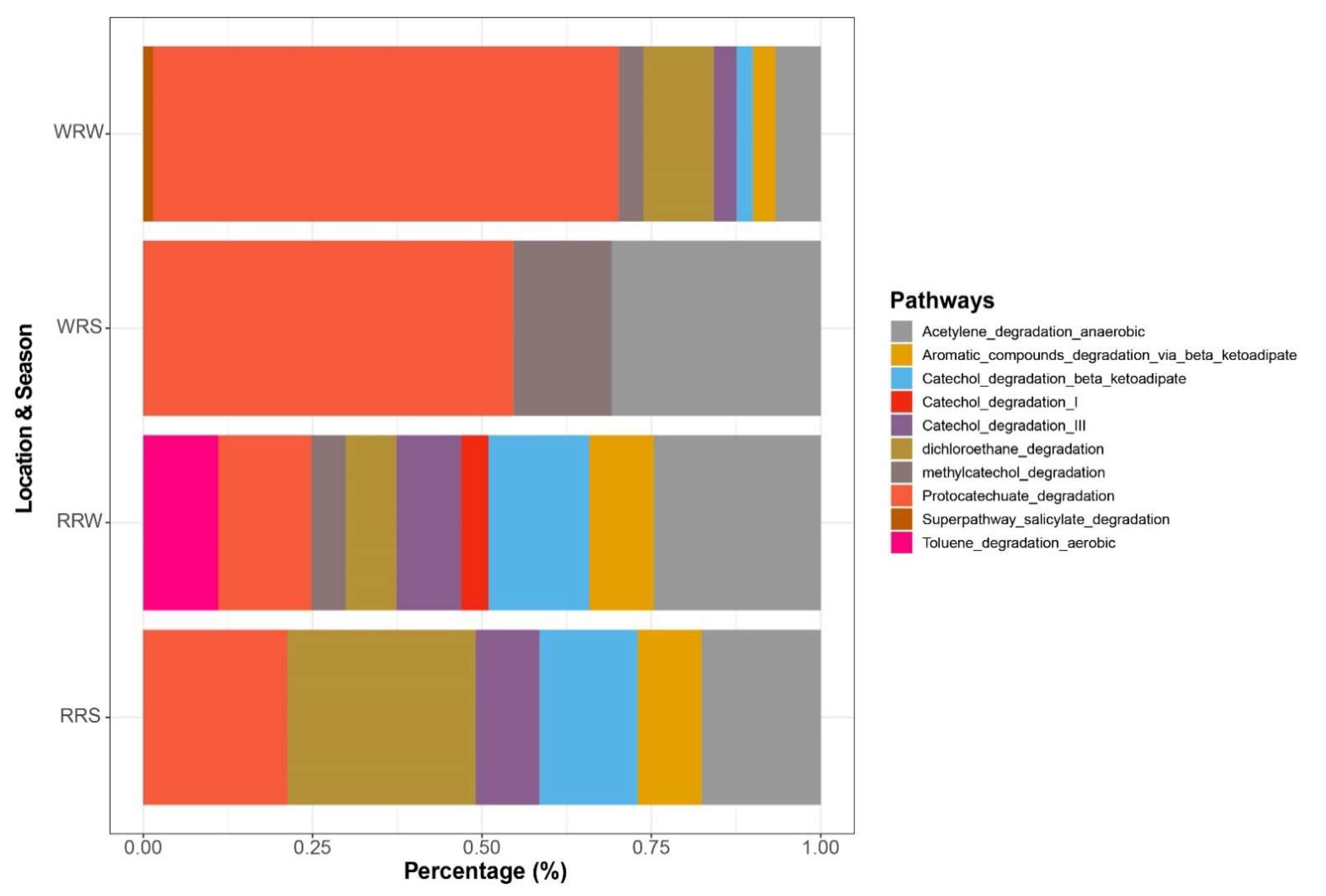 4.3. Presence of Xenobiotic Degradation Pathways and Genes Associated with Degradation in Relation to Seasonal Change