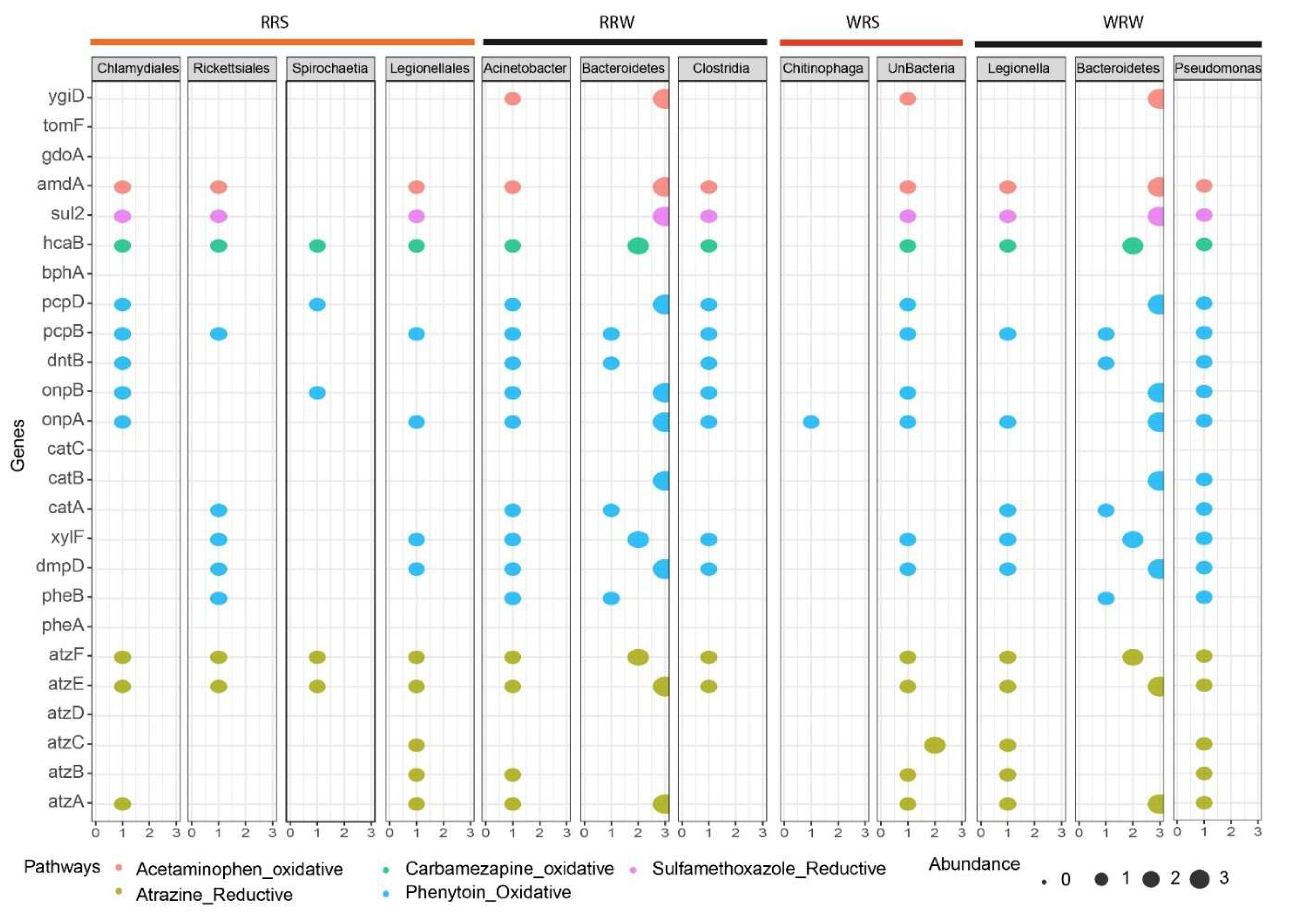 3.5. The Presence of Genes Associated with the Emerging Contaminant Degradation