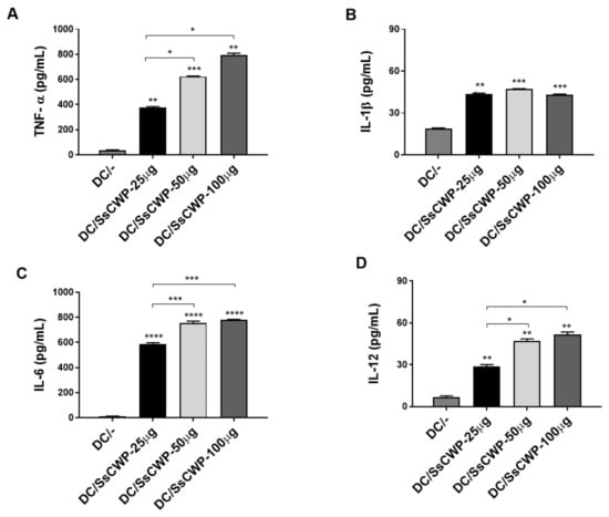 Quantification of cytokines in the culture supernatant of BMDCs stimulated or not with different concentrations of SsCWP: (A) TNF-α, (B) IL-1β, (C) IL-6, (D) IL-12. The values correspond to three cultures, and the results are expressed as the mean ± SD. DC/-: Unstimulated BMDCs. DC/SsCWP: SsCWP-stimulated BMDCs. Control (PBS). * (p < 0.05), ** (p < 0.01), *** (p < 0.001), **** (p < 0.0001) as indicated.