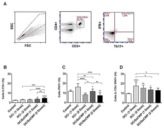Frequency of Th17A + and IFN-γ + cell expression in splenocytes after 48 h culture in the presence of the heat-inactivated fungus S. schenckii: (A) Gating strategy, (B) expression IL-17A, (C) IFN-γ and (D) double population in mice vaccinated with 1 and 2 doses of SsCWP-stimulated or not stimulated BMDCs. Results are expressed as the mean ± SD of five animals. DC: Unstimulated BMDCs. DC/SsCWP: SsCWP-stimulated BMDCs. Control (PBS). * (p < 0.05), ** (p < 0.01), *** (p < 0.001), **** (p < 0.0001) as indicated.