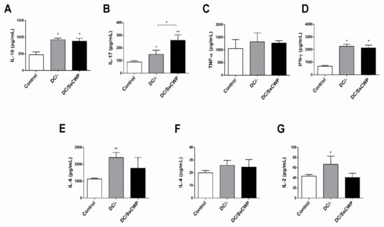 Quantification of cytokines in splenocyte culture supernatant after 48 h in the presence of the heat-inactivated fungus S. schenckii. (A) Cytokines IL-10, (B) IL-17, (C) TNF-α, (D) IFN-γ, (E) IL-6, (F) IL-4 and (G) IL-2 in vaccinated mice with BMDCs stimulated or not with SsCWP. Results are expressed as the mean ± SD of 5 animals. DC/-: Unstimulated BMDCs. DC/SsCWP: SsCWP-stimulated BMDCs. * (p < 0.05), ** (p < 0.01), significantly higher when compared to unstimulated DC or as indicated.