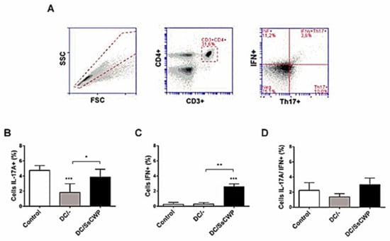 Frequency of Th17 + and IFN-γ + cell expression in the lymph node. (A) Gating strategy, % of (B) IL-17A, (C) IFN- γ, and (D) double positive population within the CD3+CD4+ splenocytes in S. schenckii-infected mice after vaccination with SsCWP-stimulated (DC/SsCWP), non-stimulated DCs (DC/-) or PBS (Control). Results are expressed as the mean ± SD of 5 animals. DC/-: Unstimulated BMDCs. DC/SsCWP: SsCWP-stimulated BMDCs, and Control (PBS) * (p < 0.05), ** (p < 0.01), *** (p < 0.001) as indicated.