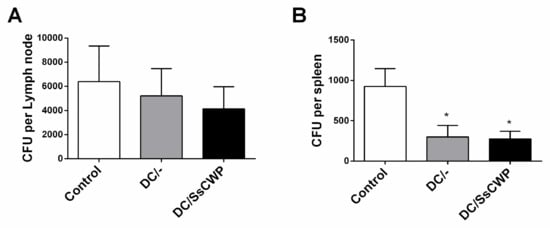 CFU recovered from the popliteal lymph node and spleen of S. schenckii-infected mice after vaccination with SsCWP-stimulated or non-stimulated DCs. (A) CFU per lymph node and (B) CFU per spleen. Results are expressed as the mean ± SD of 5 animals. DC/-: Unstimulated BMDCs. DC/SsCWP: SsCWP-stimulated BMDCs * (p < 0.05) were significantly lower when compared to the Control (PBS) group, as indicated.