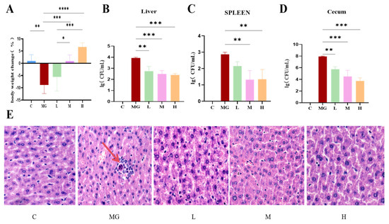 Effect of probiotic pretreatment on body weight, bacterial load in tissues, and liver histopathology in mice infected with S. Typhimurium. (A) Body weight change (%) in each group: control; (B–D) Bacterial load (log CFU/mL) in the liver (B), spleen (C), and cecum (D) of mice from different groups. (E) Representative H&E-stained liver sections from each group (magnification ×20). C: normal hepatic architecture with well-arranged hepatocyte cords; MG: obvious hepatocellular swelling, inflammatory cell infiltration, and disordered hepatic cords; L-H: probiotic pretreatment alleviated histopathological damage in a dose-dependent manner. Data are expressed as mean ± SEM, and statistical differences are indicated as * p < 0.05, ** p < 0.01, *** p < 0.001, and **** p < 0.0001.