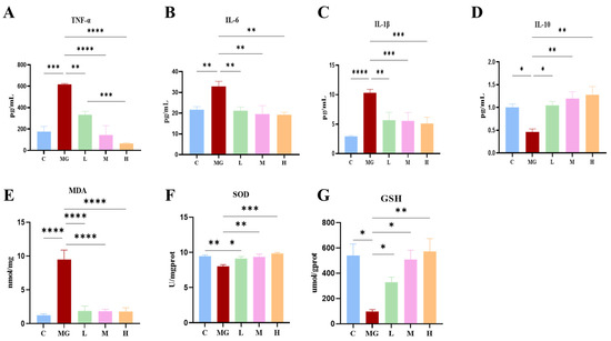 The MG group exhibited significantly elevated levels of TNF-α, IL-6, and IL-1β compared with the C group (p < 0.01 or p < 0.001) (Figure 2). Conversely, IL-10 levels were considerably reduced in the MG group (p < 0.05). Pretreatment with P. acidilactici M22 effectively mitigated these inflammatory changes in a dose-dependent manner. Specifically, the M and H groups demonstrated a significant reduction in TNF-α, IL-6, and IL-1β levels compared with the MG group, while IL-10 concentrations were restored toward normal levels (p < 0.01).
