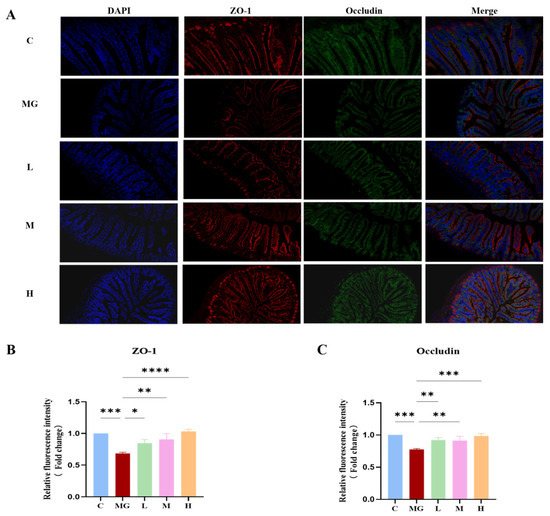 As shown in Figure 3A, H&E staining revealed that jejunal villi in the C group were intact, were regularly arranged, and displayed moderate crypt depth. In contrast, the MG group exhibited obvious villus atrophy and disorganization accompanied by deepened crypts, indicating severe intestinal injury. Administration of P. acidilactici M22 at low (L), medium (M), and high (H) doses markedly improved the jejunal morphology compared with the MG group, as reflected by elongated villi and reduced crypt depth, with the effect of greatest magnitude observed in the H group.