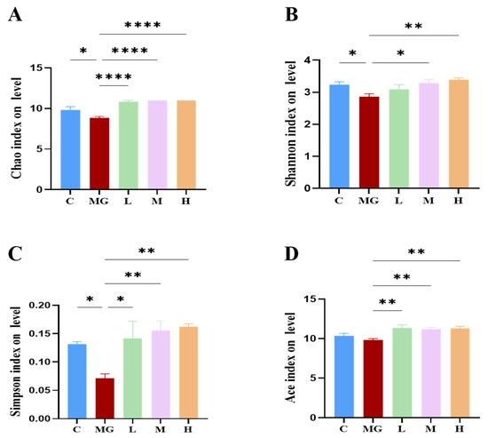 To assess the effects of probiotic pretreatment on the gut microbial community, alpha diversity indices (Chao1, Shannon, Simpson, and Ace) were analyzed (Figure 5A–D). S. Typhimurium infection significantly reduced the Chao1 index (p < 0.05) compared with the C group, indicating a loss of microbial richness. All probiotic pretreatment groups (L, M, H) exhibited significantly higher Chao1 values than the MG group (p < 0.0001), approaching control levels.