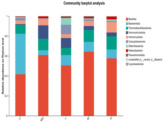 At the phylum level (Figure 7), 16S rRNA gene sequencing revealed that Bacillota and Bacteroidota were the dominant taxa in all groups. In the C group, the proportion of Bacteroidota was relatively high, whereas S. Typhimurium infection (MG group) resulted in a marked increase in Bacillota and Verrucomicrobiota, accompanied by a decrease in Bacteroidota. Probiotic pretreatment (L, M, H groups) partially restored the relative abundance of Bacteroidota and reduced Verrucomicrobiota compared with the MG group. These three phyla—Bacillota, Bacteroidota, and Verrucomicrobiota—represent major components of the normal intestinal microbiota.
