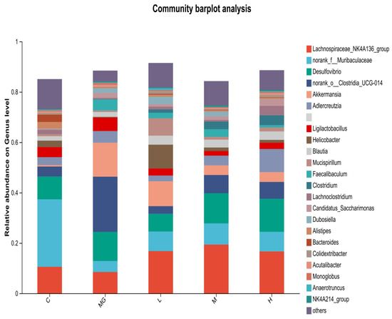 At the genus level (Figure 8), Muribaculaceae and Lachnospiraceae were abundant in the C group. The MG group exhibited a reduction in Muribaculaceae and an increase in Akkermansia and Clostridia compared with controls. Probiotic pretreatment increased the relative abundance of beneficial genera such as Lachnospiraceae, Muribaculaceae, and Ligilactobacillus, while decreasing potentially harmful genera including Desulfovibrio and Helicobacter. Notably, Akkermansia abundance was higher in the MG group than in the probiotic-treated groups, whereas Ligilactobacillus was more abundant in the L, M, and H groups than in MG.
