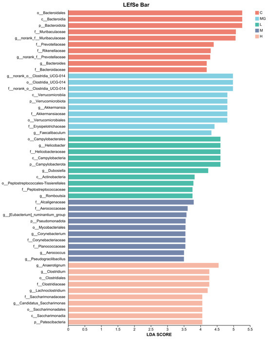 To investigate the differences in key bacterial taxa among groups, we performed an LEfSe analysis. The LDA score obtained from LEfSe analysis confirmed and visualized the characteristic microbial biomarkers of each group (Figure 10). In the C group, taxa such as Bacteroidales, Bacteroides, and members of Muribaculaceae and Prevotellaceae were significantly enriched compared with other groups. The MG group was characterized by a higher abundance of Clostridia UCG-014, Verrucomicrobiota, Akkermansiaceae, and Akkermansia, including A. muciniphila.