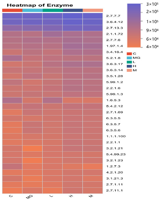 To characterize the functional capacity of the gut microbiota, PICRUSt2 analysis was performed to forecast KEGG pathway, and a heatmap was generated to display the relative abundance of functional enzyme categories across groups (Figure 11). S. Typhimurium infection (MG group) altered the abundance of multiple predicted microbial enzymes compared with the C group, particularly those involved in carbohydrate metabolism (e.g., EC 2.7.7.7, EC 3.6.4.12), amino acid metabolism (e.g., EC 2.1.1.72, EC 1.97.1.4), and energy production pathways (e.g., EC 5.1.2.8, EC 1.1.1.100).