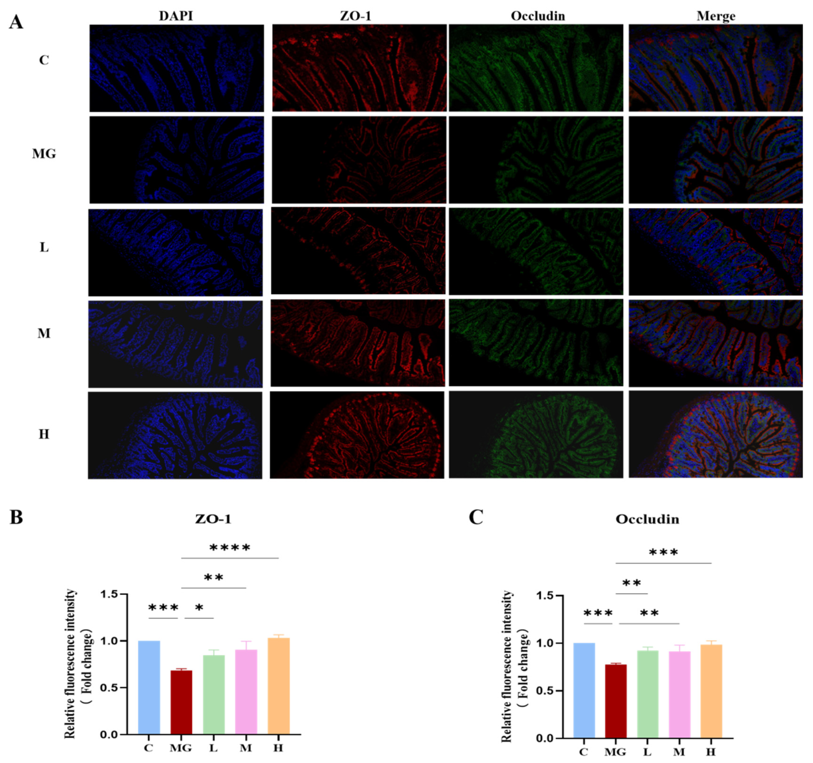 2.8. Immunofluorescence Staining for Intestinal Tight Junction Proteins