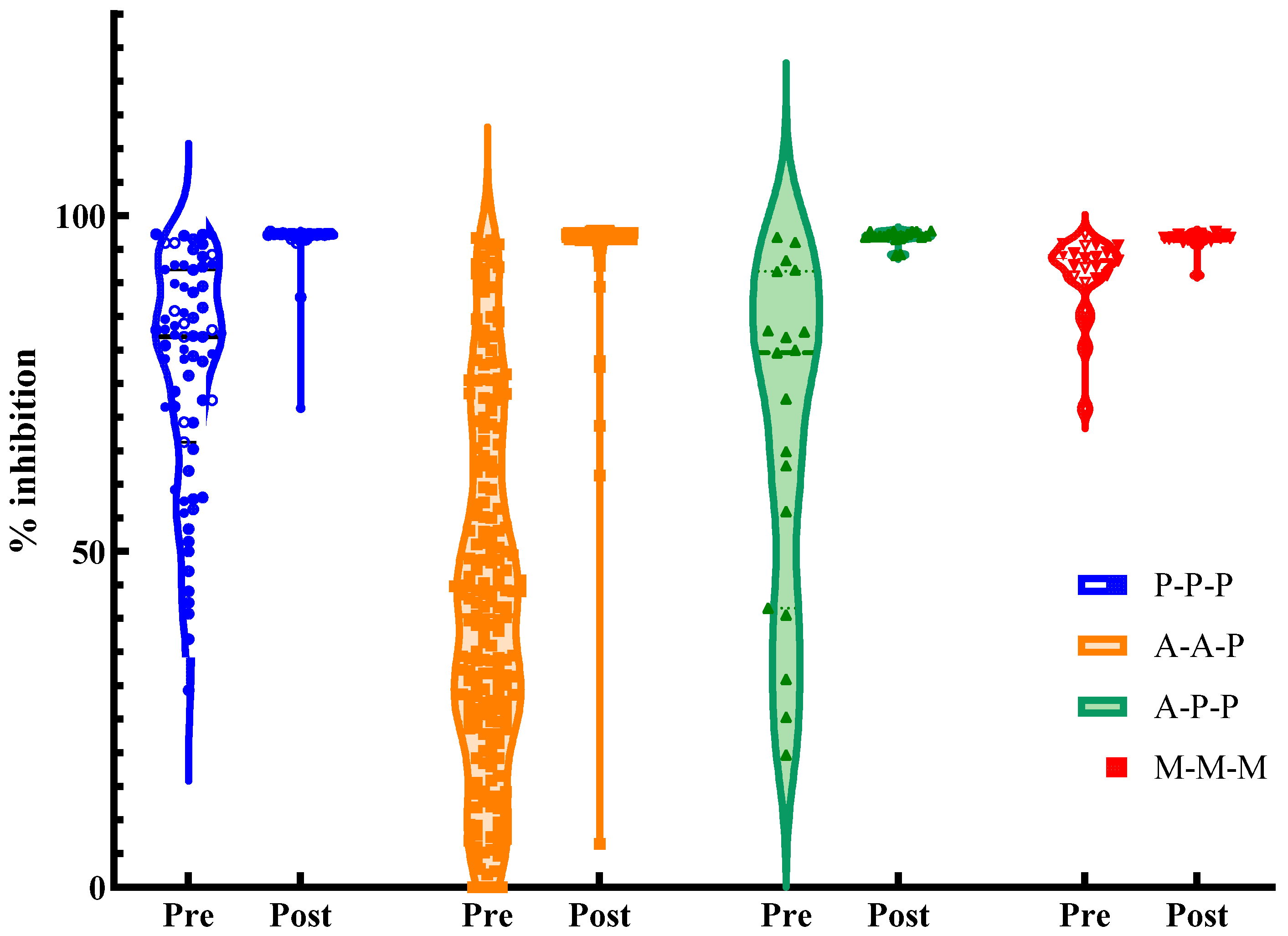 Inhibition (%), median (IQR) | 82 (68–91) | 40 (25–62) | 80 (49–87) | 93 (91–94) | 0.000 |