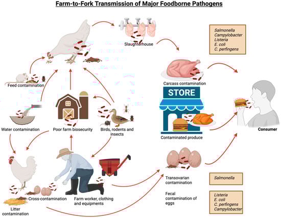 The combined impacts of these pathogens create a dual burden. For poultry producers, disease outbreaks lead to direct losses: high mortality, reduced growth or egg production, and costs for treatment, culling, or sanitation. For example, E. coli and Salmonella outbreaks often force whole flock culling or product recalls. One recent report in 2023 estimates that in the US, foodborne illnesses alone cost about $75 billion annually in economic loss, in large part due to bacterial pathogens. Among these major pathogens, Salmonella alone accounts for $17 billion, Campylobacter for $11 billion, Listeria for $4 billion, diarrheagenic E. coli for $3.7 million and C. perfringens for $343 million in associated costs [12,13]. The impact of these infections is widespread, with an estimated 49 million cases occurring annually in the US, affecting approximately 15% of the population. Reports indicate that foodborne pathogens caused approximately 350 million cases of illness globally in 2010, with food animals serving as asymptomatic carriers of these bacteria. Among the 86 known transmissible diseases from animals to humans, 20 are bacterial in origin [14]. Figure 1 illustrates the different pathways of transmission for these foodborne pathogens.