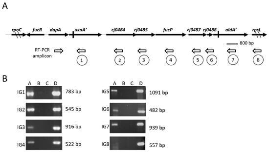- Middendorf, P.S.; Wijnands, L.M.; Boeren, S.; Zomer, A.L.; Jacobs-Reitsma, W.F.; den Besten, H.M.W.; Abee, T. Activation of the l-fucose utilization cluster in Campylobacter jejuni induces proteomic changes and enhances Caco-2 cell invasion and fibronectin binding. Heliyon 2024, 10, e34996. [Google Scholar] [CrossRef] [PubMed]