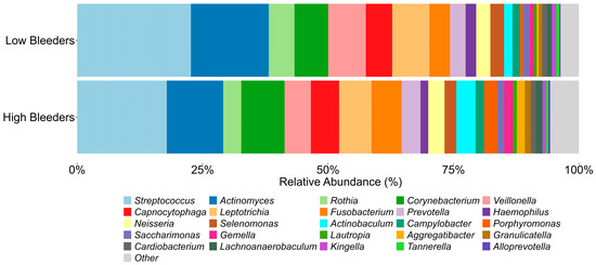 Oral microbiome components from high bleeders vs. low bleeders. The top 25 genera detected from the supragingival plaque of high bleeders and low bleeders at baseline.
