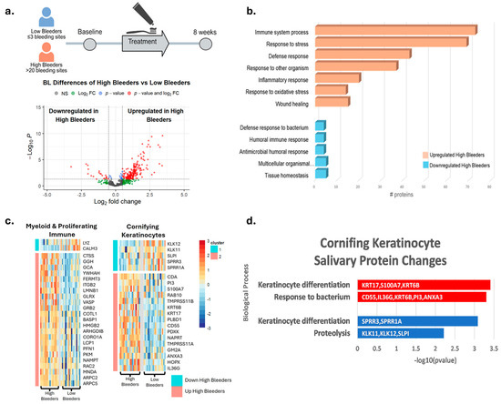 Proteomics and single-cell integration analyses reveal differentially expressed proteins at baseline in high bleeders compared with low bleeders. (a) Proteomics study design: Saliva samples were collected from high and low bleeders at baseline and after eight weeks of toothpaste treatment. The volcano plot illustrates the differentially expressed proteins between high and low bleeders at baseline, using a fold change (FC) ≥ 1.5 and a p-value ≤ 0.05 as criteria. The x axis represents log2 fold change. The y axis represents −log10 (p value). Grey dots represent proteins without significant changes (NS: not significant); red dots indicate proteins with a significant fold change (p ≤ 0.05 and FC ≥ 1.5); blue dots represent proteins with significant changes (p ≤ 0.05) but with FC < 1.5; green dots signify proteins with FC ≥ 1.5 but not significant (p > 0.05). (b) Enrichment analysis of the differentially expressed proteins highlights the biological processes associated with the proteins that are upregulated and downregulated in high bleeders. (c) Single-cell overlay of protein changes reveals specific markers of myeloid and cornifying keratinocytes that are altered in high bleeders. (d) Functional enrichment analyses of protein changes associated with markers of the cornifying keratinocyte population are linked to altered keratinocyte differentiation and bacterial response. Red indicates upregulation, while blue denotes downregulation.