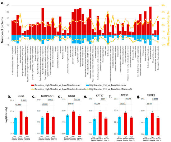 We compared the identified proteomic biomarkers with the human plasma disease biomarkers from the “Atlas of the Plasma Proteome in Health and Disease” [27]. In total, 192 proteins showed significant differences between high bleeders and low bleeders at baseline; 71 of those were disease biomarkers that overlapped with the plasma proteomics atlas. These 71 baseline gingivitis proteomic biomarkers correlated with biomarkers associated with a range of human diseases, including infectious diseases, cardiovascular conditions, diabetes, dementia, and depression. A subset is shown in Figure 3a. The overlapped oral protein biomarkers are roughly 1–4% of the disease biomarkers reported in the plasma proteomics atlas. We further revealed that, after eight weeks of treatment with SnF2 dentifrice, 80 proteins showed significant changes in high bleeders compared with baseline data. In total, 29 of them are referenced in the plasma atlas as disease biomarkers. The treatment-induced protein change indicates a shift from disease towards a healthier status. Overall, 25–40% of the overlapped disease biomarkers were altered after eight weeks of treatment in a “healthy” direction. This suggests that stannous treatment can positively impact these biomarkers. There are 18 proteins in all three datasets: ALDH1A1, APEX1 (Figure 3b), CD55 (Figure 3c), CHIT1, F2, GBP6, GGCT (Figure 3d), GM2A, KLK12, KRT17 (Figure 3e), MTPN, MYDGF, NAPRT, PI3, PSME2 (Figure 3f), SERPINC1 (Figure 3g), TMPRSS11B, and YWHAQ. It has been reported that increased plasma levels of APEX1, CD55, PSME2, and SERPINC1 are significantly associated with hypertension, and increased plasma levels of APEX1, CD55, GGCT, KRT17, PSME2, and SERPINC1 are associated with diabetes (Table S5) [27]. At baseline, the levels of these proteins were higher in high bleeders compared with low bleeders. After eight weeks of treatment, there was a decrease in protein levels from baseline, particularly in high bleeders.