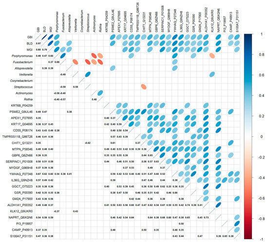 Correlation between the relative abundance of selected genera from supragingival plaques of all subjects, clinical measurements, and selected protein measurement at baseline. The various correlation comparisons are listed on the X and Y axes, with correlation directionality and magnitude indicated by the color and size of the ellipse (statistically significant correlations only). The bottom half of the graph shows the Spearman correlation coefficient with p ≤ 0.05.