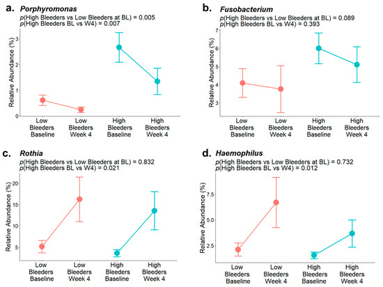 Representative bacterial genera relative abundance of low and high bleeders at baseline and after four weeks of SnF2 toothpaste treatment. (a) Relative abundance of Porphyromonas. (b) Relative abundance of Fusobacterium. (c) Relative abundance of Rothia. (d) Relative abundance of Haemophilus.