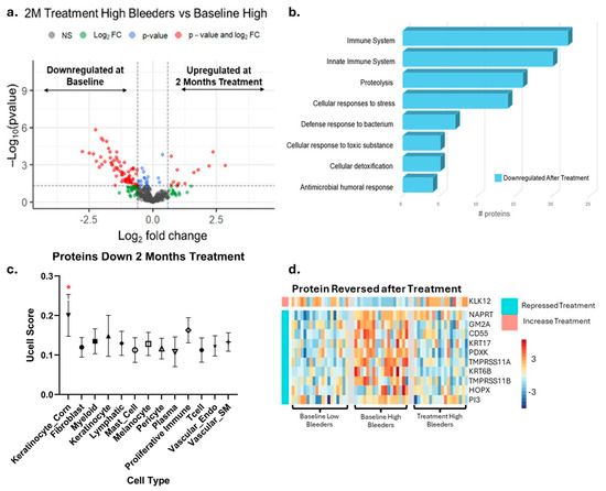 The proteomics data revealed a total of 80 proteins that were significantly different in high bleeders when comparing eight weeks of treatment to baseline. Of these, 69 proteins were downregulated after treatment, while 11 were upregulated (Figure 6a, Supplementary Tables S6 and S7). An enrichment analysis revealed that the downregulated proteins are primarily involved in proteolysis, antimicrobial humoral responses, cellular responses to stress, and immune system processes (Figure 6b).