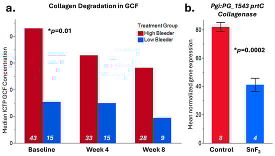 Collagen degradation results. (a) Crosslinked carboxyterminal telopeptide of type I collagen (ICTP) from GCF (gingival crevicular fluid) samples was measured at baseline, Week 4, and Week 8 in both high bleeders and low bleeders. The median value is displayed in the graph, significant differences at baseline between high and low bleeder samples were observed with p = 0.01. (b) In vitro, the RNASeq result [34] showed that the P. gingivalis collagenase prtC gene expression is inhibited by SnF2 treatment with p = 0.0002. Sample numbers for each leg are listed inside the bar with white color.