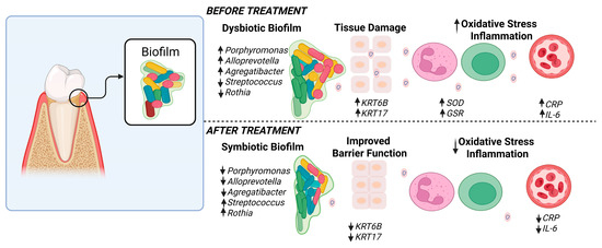 Hypothesis of host microbial changes. This schematic illustration depicts the hypothesized alterations before and after SnF2 treatment. Before treatment, there is an increased biofilm accumulation associated with microbiota dysbiosis and a higher prevalence of pathogenic species in the high-bleeder sites. Additionally, dominant protein changes are linked to barrier/tissue damage, oxidative stress, and inflammation. After treatment, the biofilm composition changed. It is hypothesized that biofilm transitions to a symbiotic state, resulting in improved barrier function and reduced oxidative stress and inflammation. Figure created in BioRender.com.