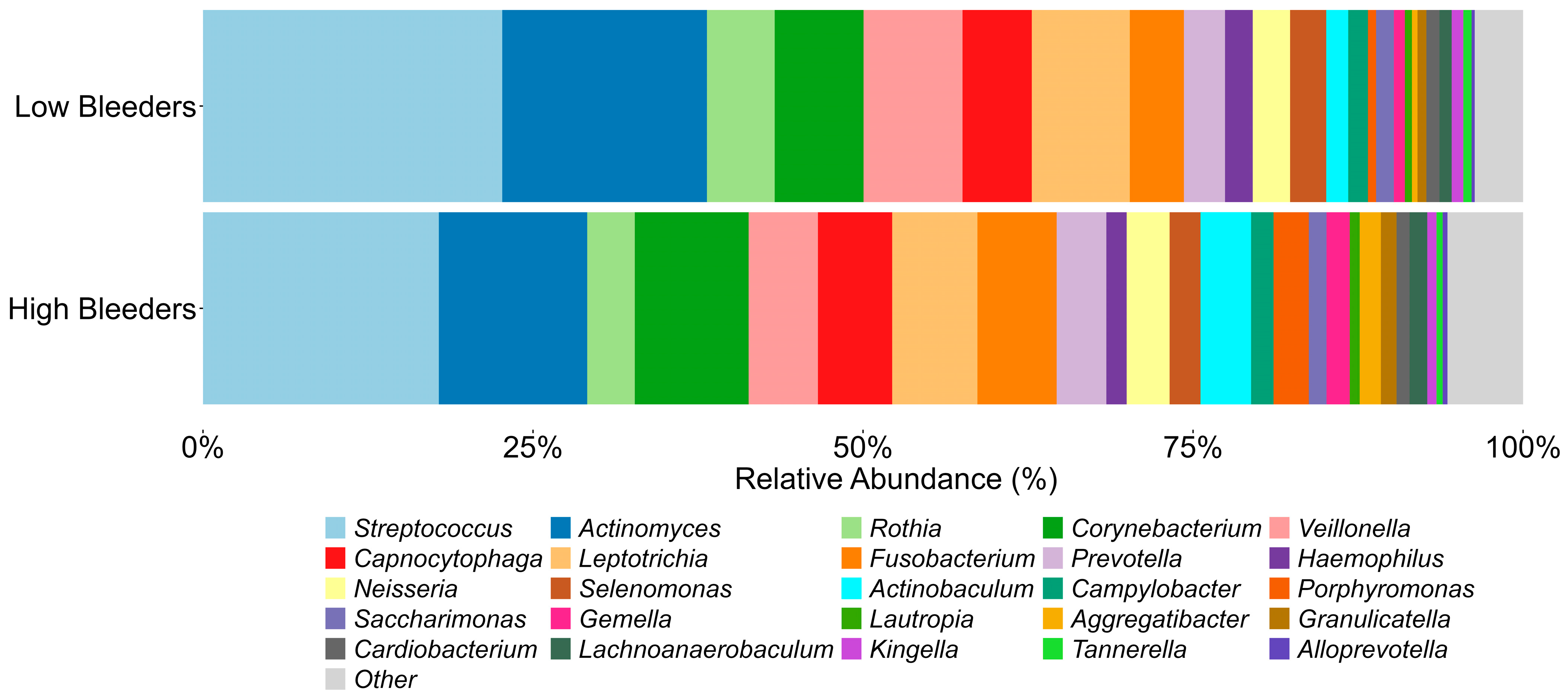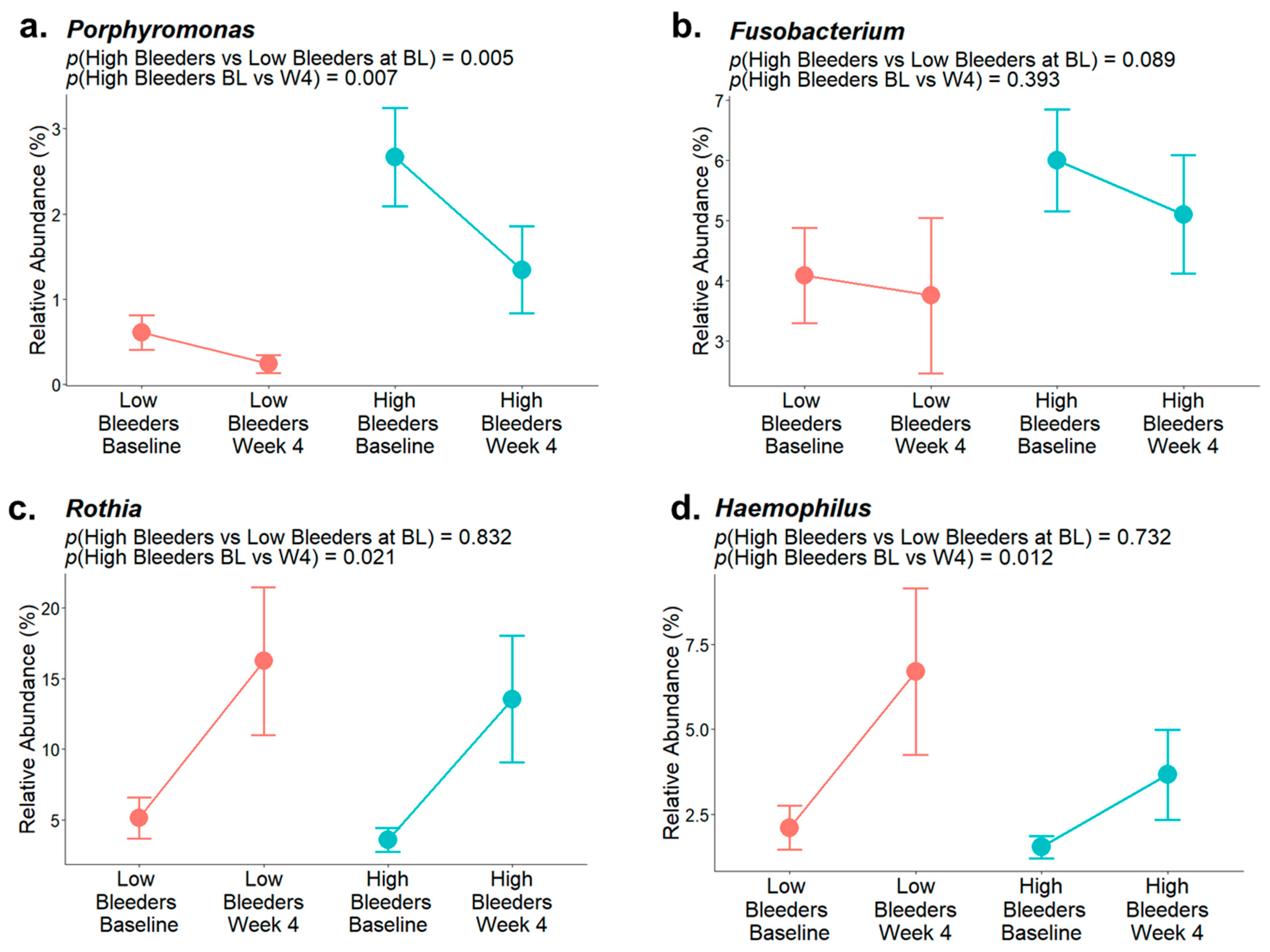3.1. Supragingival Plaque Microbiome Differs in High Bleeder vs. Low Bleeder at Baseline