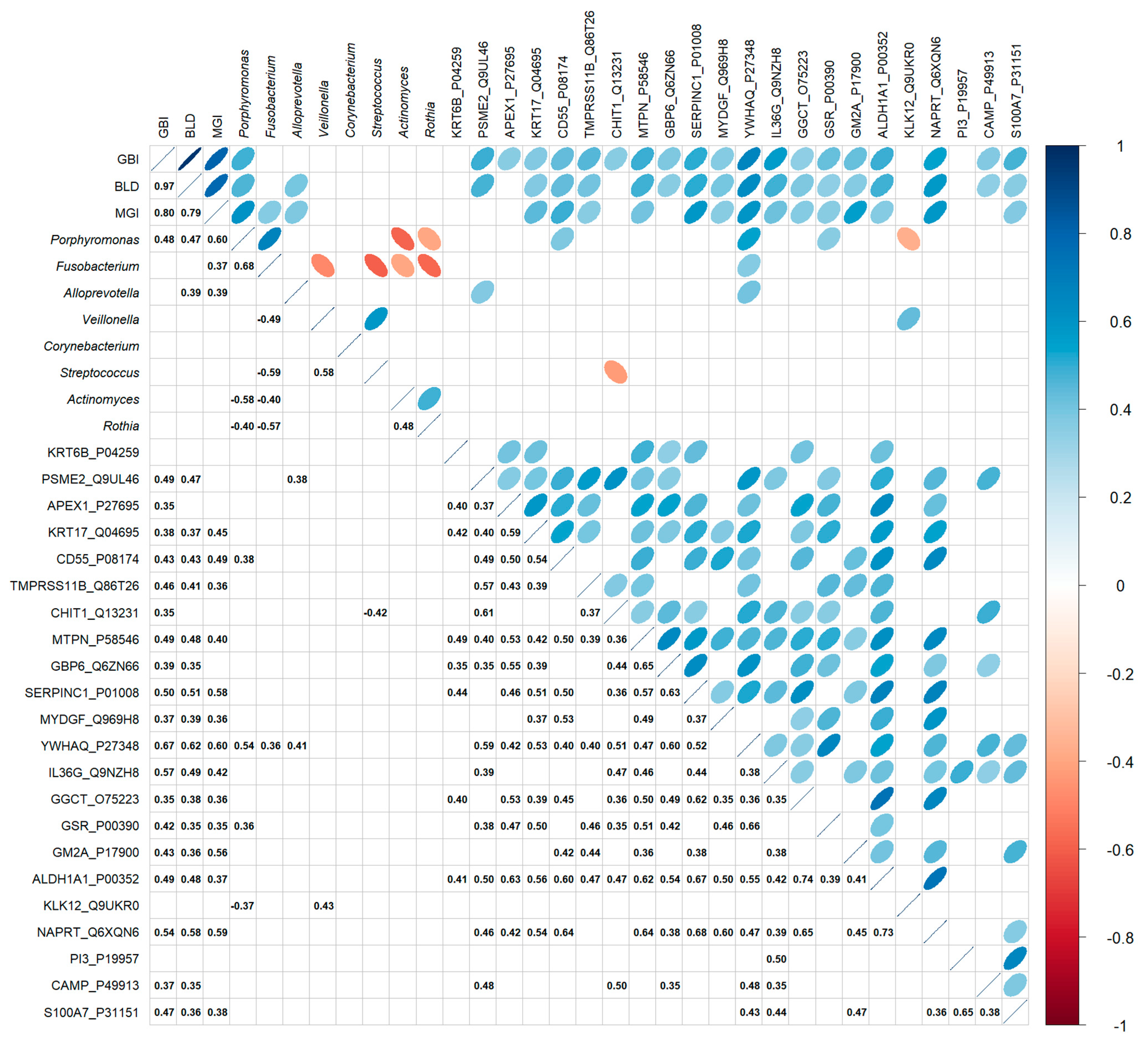 3.4. Correlation of the Clinical Measurements, Proteomics, and Microbiome