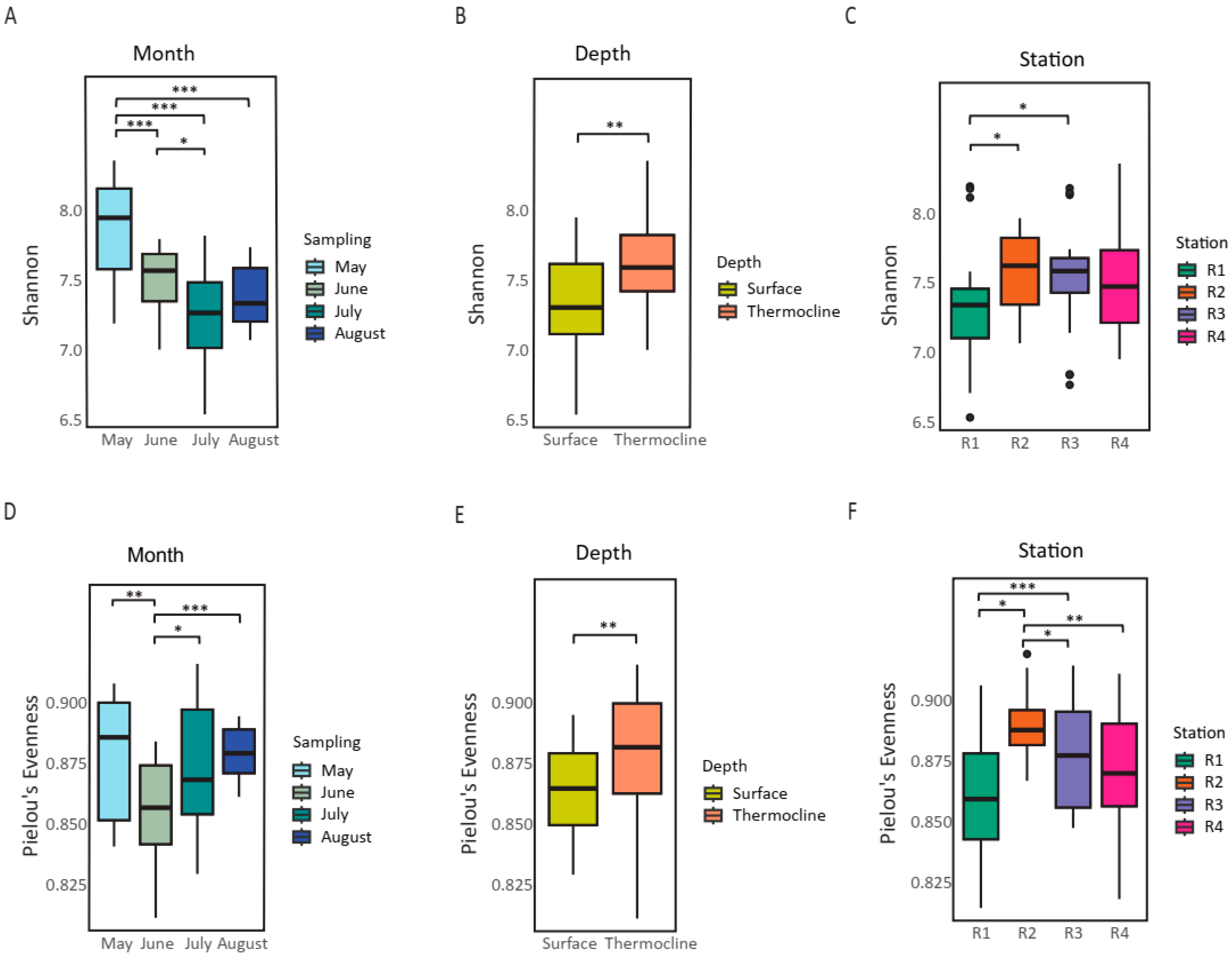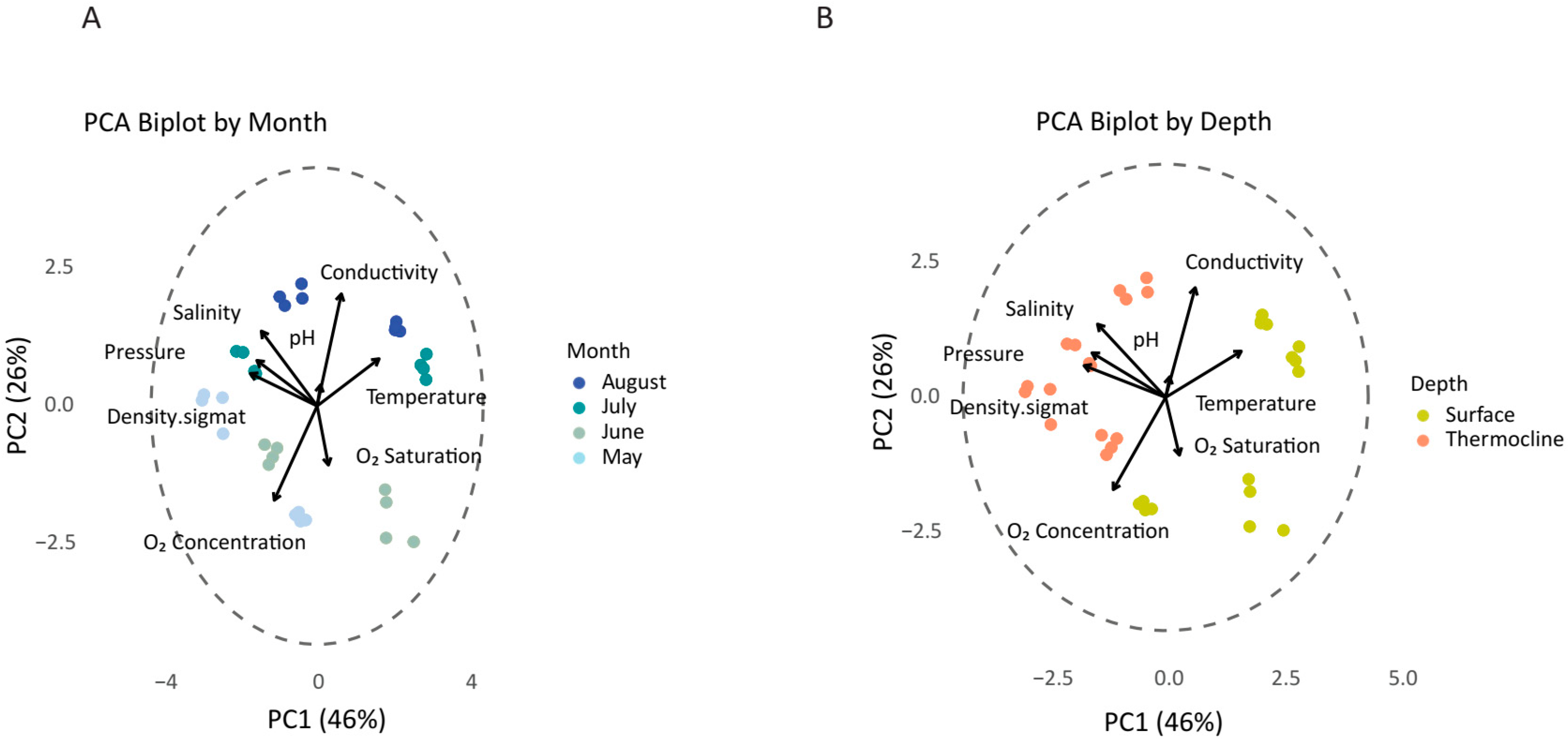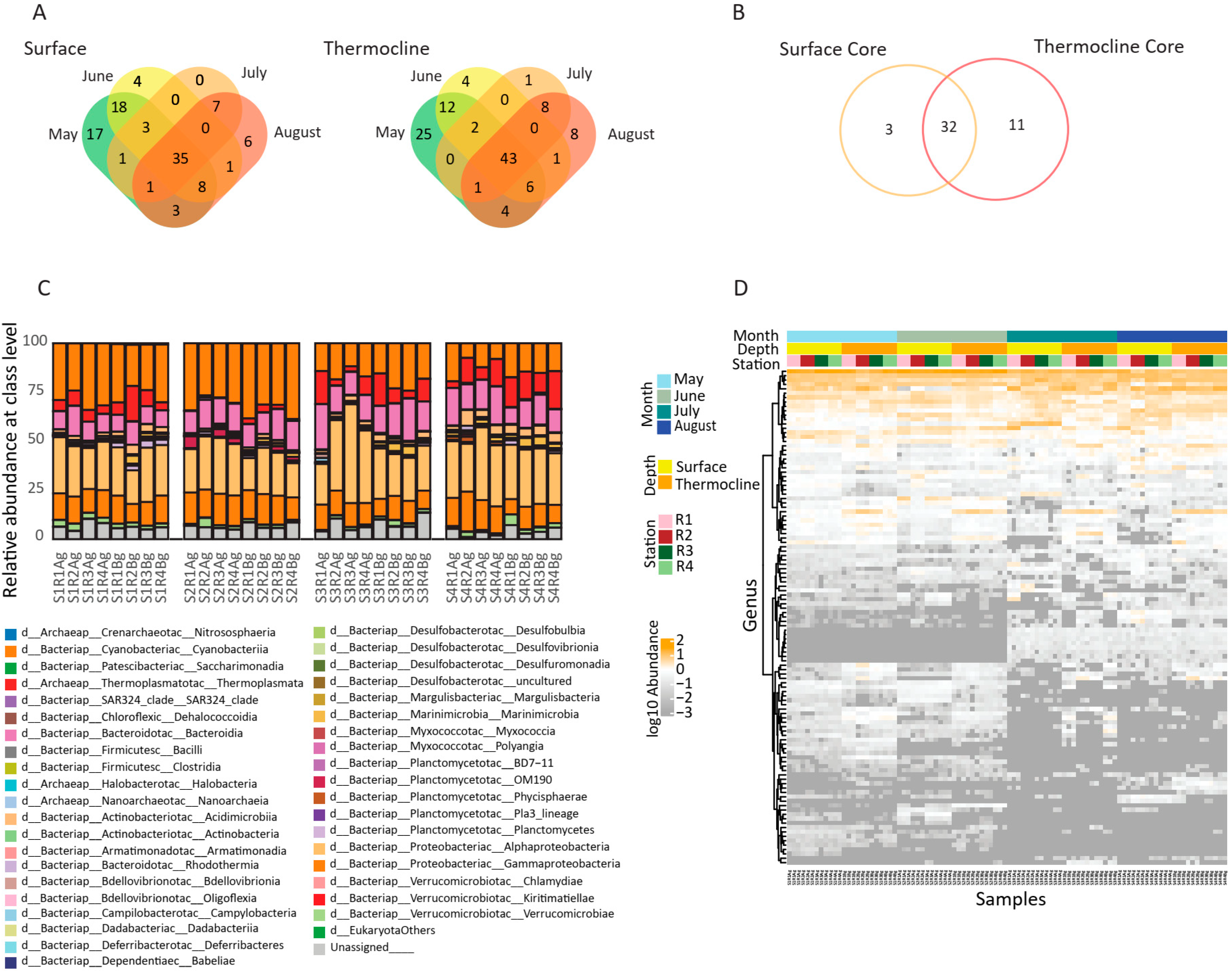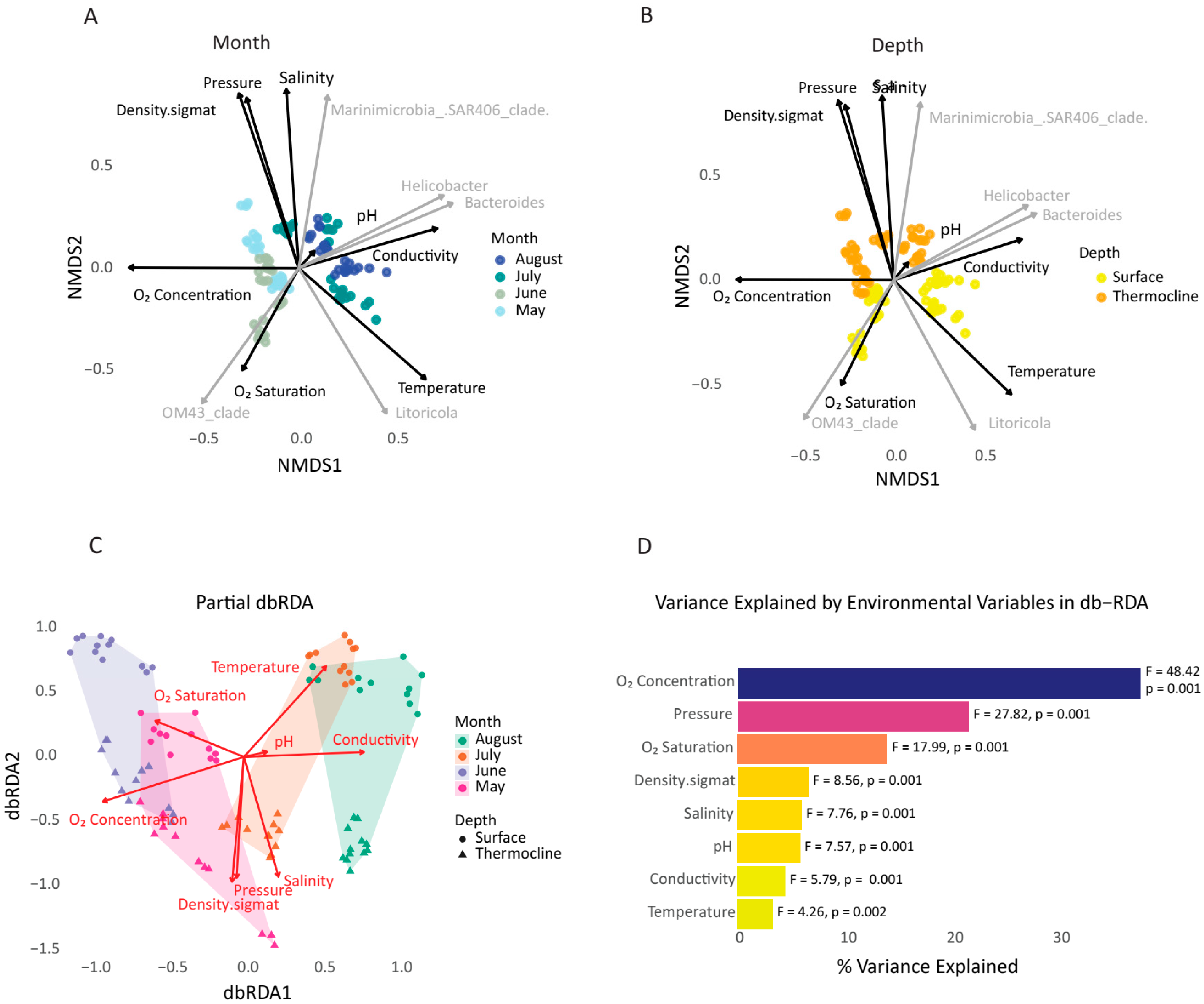 3.2. Temporal and Depth Affect the Microbiome Diversity