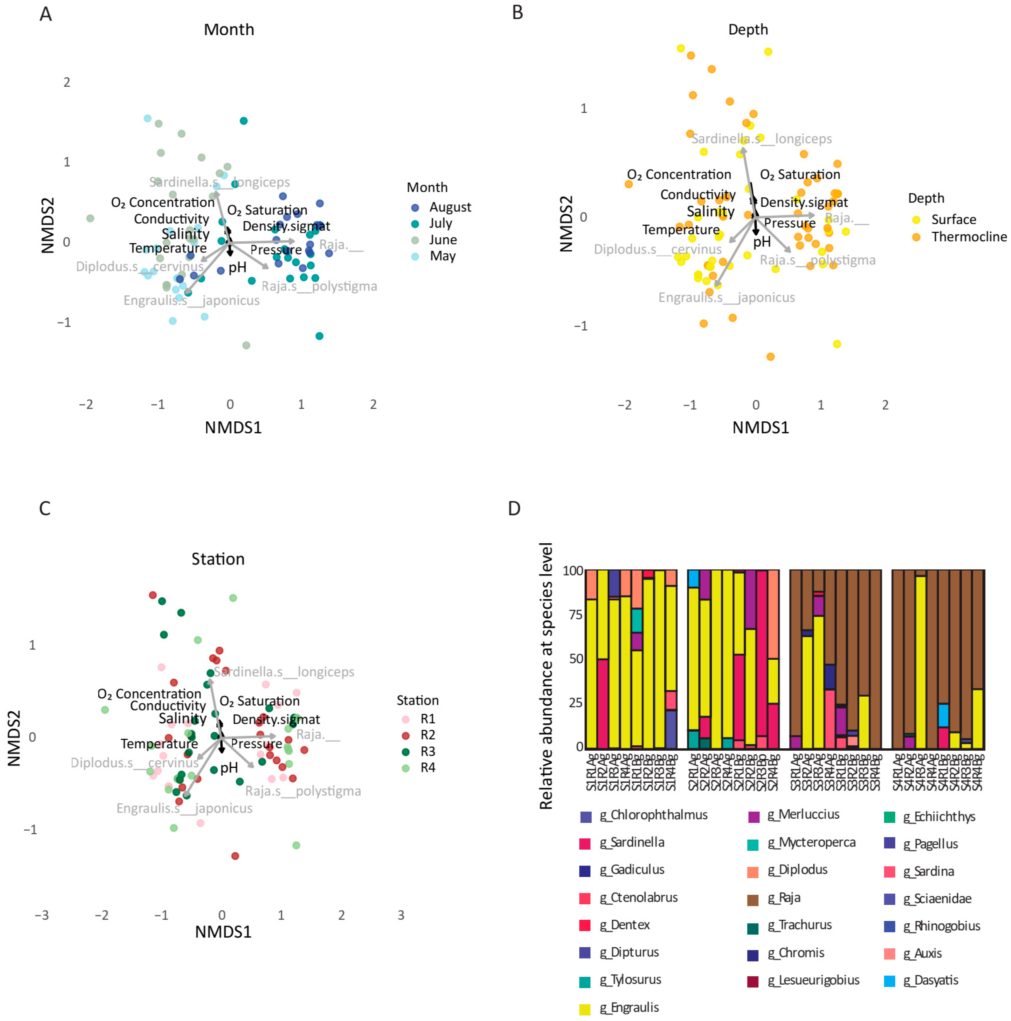 - Djurhuus, A.; Closek, C.J.; Kelly, R.P.; Pitz, K.J.; Michisaki, R.P.; Starks, H.A.; Walz, K.R.; Andruszkiewicz, E.A.; Olesin, E.; Hubbard, K. Environmental DNA reveals seasonal shifts and potential interactions in a marine community. Nat. Commun. 2020, 11, 254. [Google Scholar] [CrossRef]