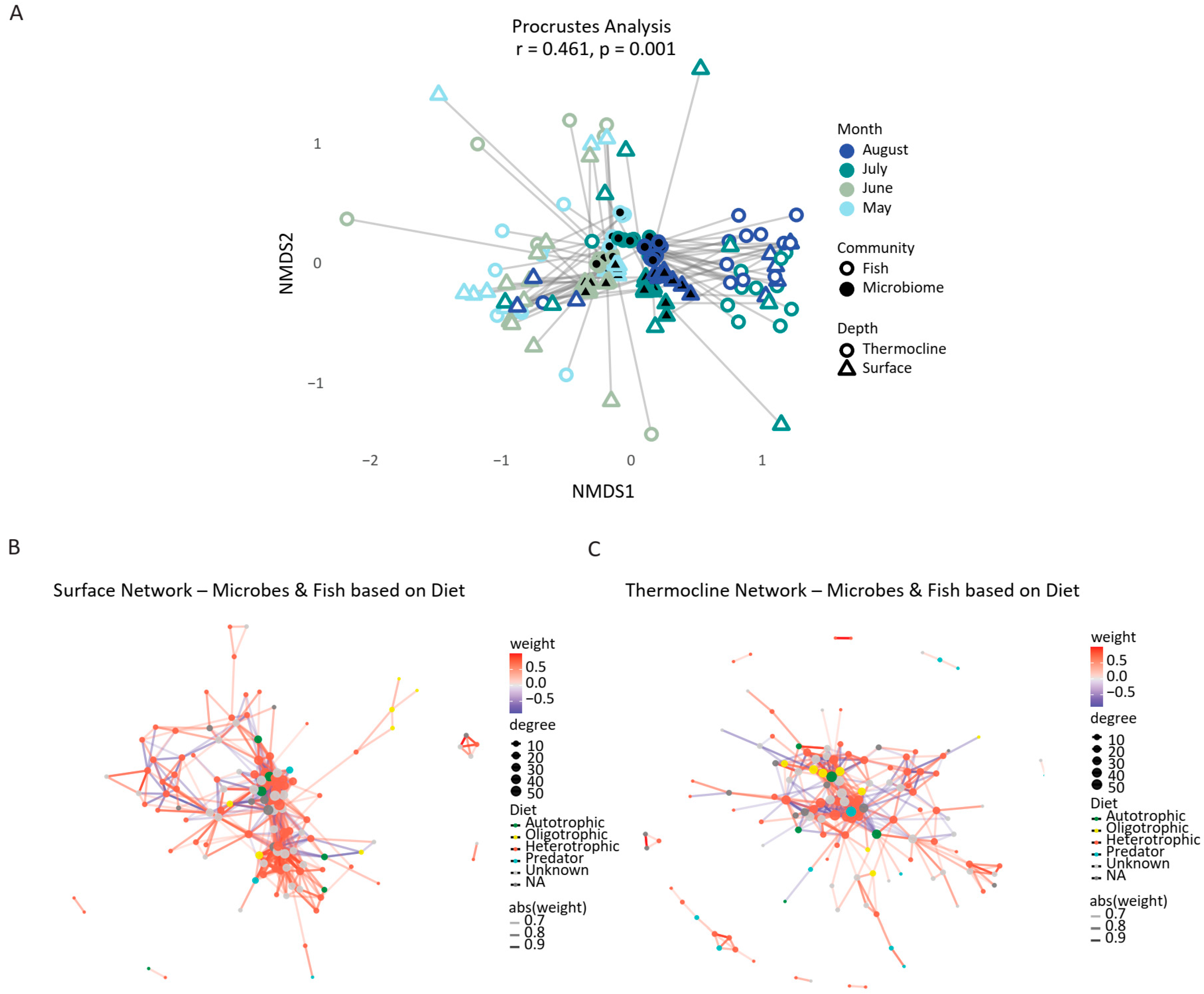 2.6. Comparative Analysis of Microbiome and Ichthyofauna