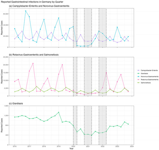 Reported cases of selected GI-infections in Germany between 2016 and 2023 according to the German Infection Protection Act (IfsG) § 7: reporting of all laboratory confirmed cases. Lockdown periods in Bavaria are highlighted within dotted boxes. During the lockdown years of 2020–2022, the number of cases reported for these selected GI diseases decreased overall. In non-restricted quarters, the reporting numbers of (a) campylobacter enteritis, norovirus-gastroenteritis (b) salmonellosis and rotavirus-gastroenteritis, and (c) giardiasis were higher than in lockdown periods [15]. School closures only occurred during the first two lockdown periods.